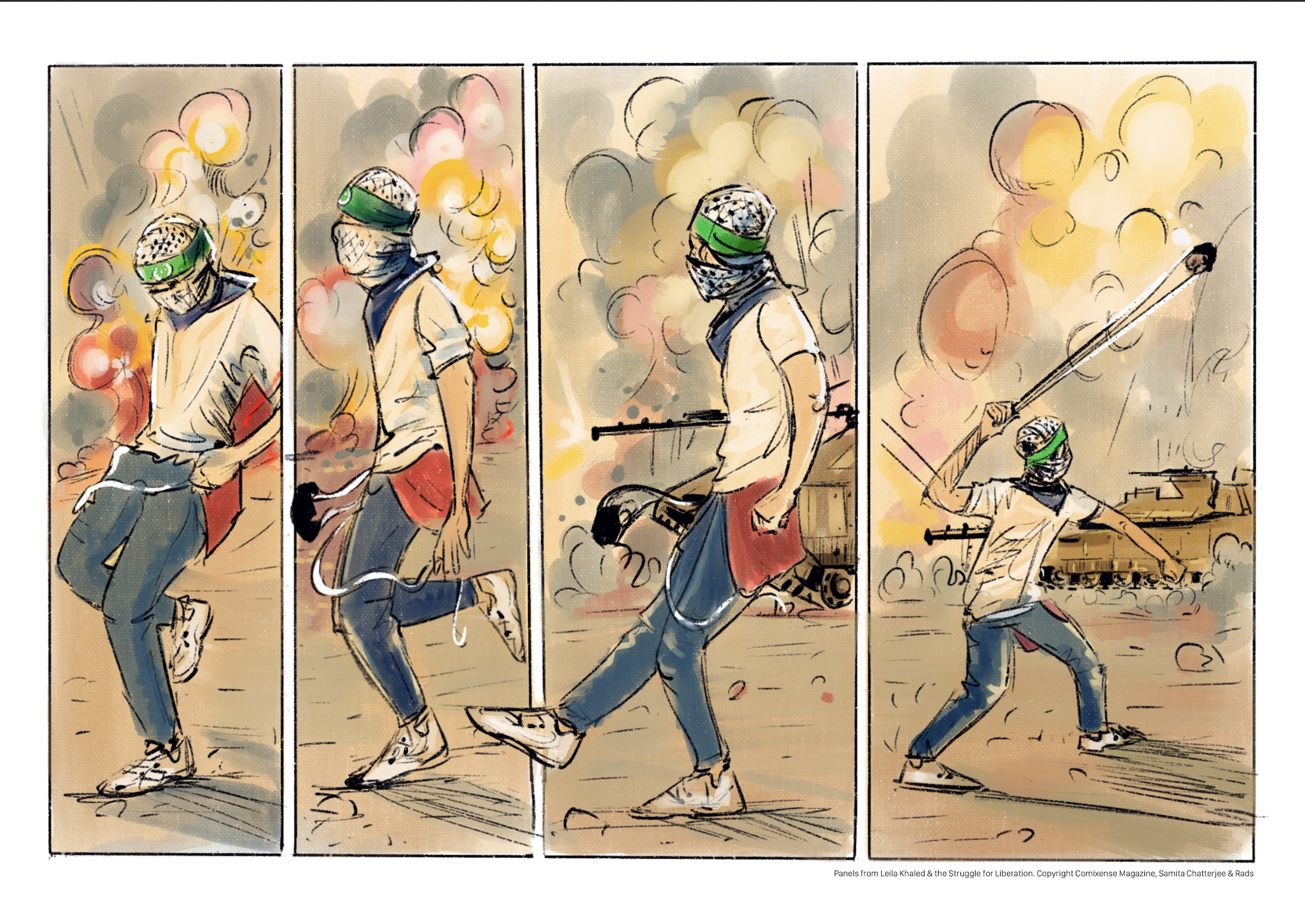 Panels from the comics short story Leila Khaled and the Struggle for liberation, published by Comixense for their October issue. By Samita Chatterjee (aka Samsam) and RadS.